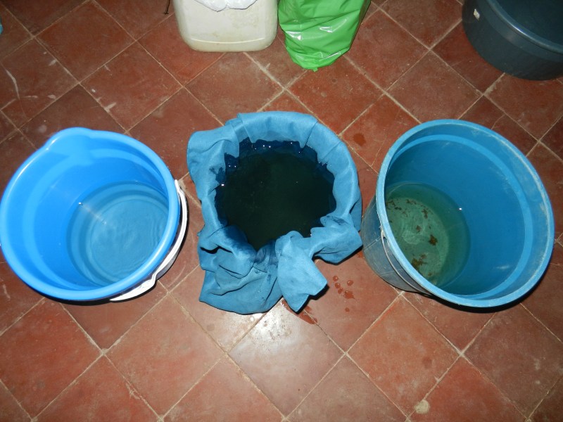 My filtration system from the dirty well. (Right) untreated well water, (Center) filtering through a chamois towel, (Left) boiled and chlorinated.
