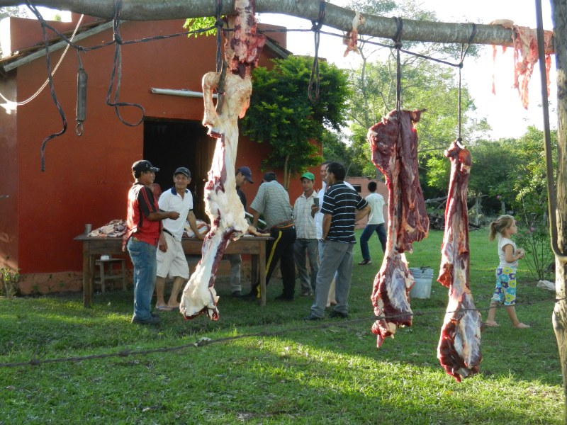 Fiesta Patronal 2014; A 2-day affair, Day 1 of our fiesta begins with killing a cow and preparing the meat for tomorrow’s BBQ. Large parts are hung until ready for cutting into smaller chunks. Day 2 is the actual BBQ and giant all-day party.
