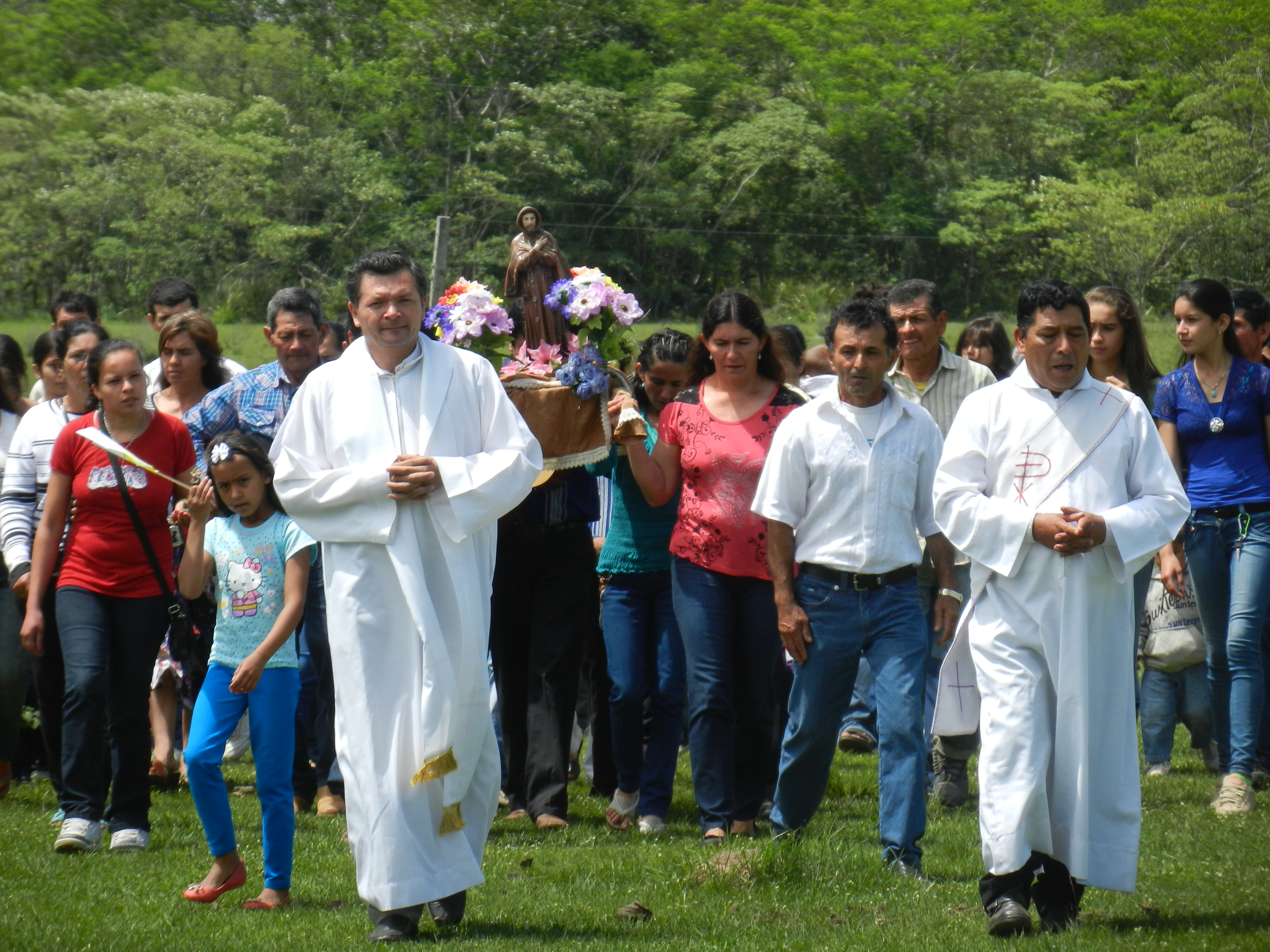 Fiesta Patronal 2014; at the end of morning mass the priests lead the march around the soccer field with locals carrying a figure of St. Francis. A very solemn occasion save for the occasional fireworks.