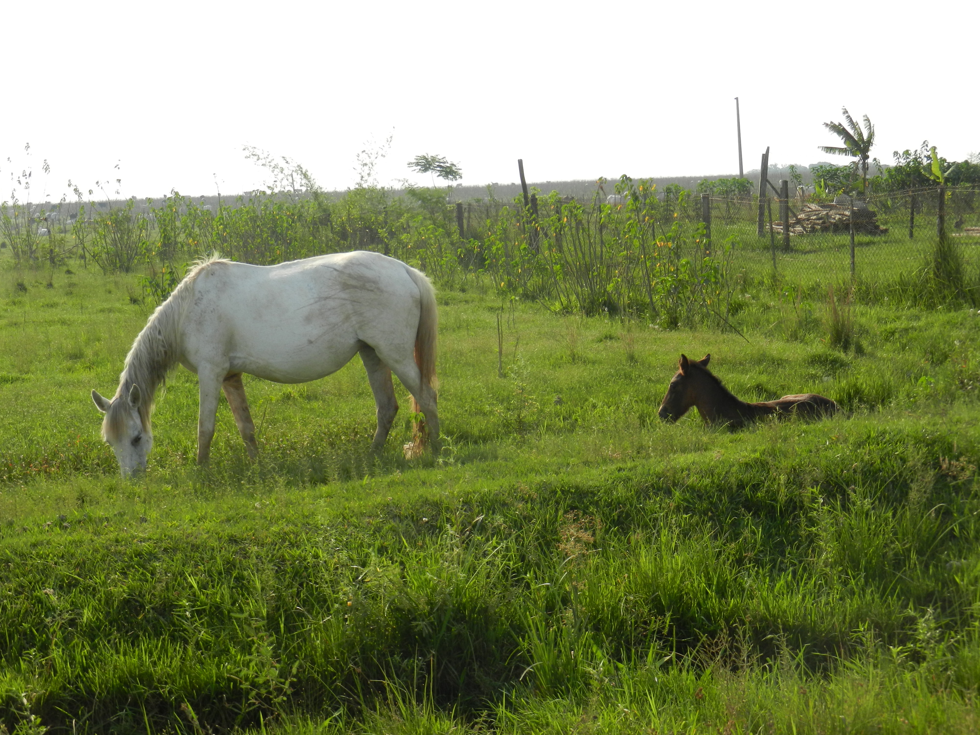 Roadside sweetness: a foal rests on the bank of a ditch while its mama grazes nearby