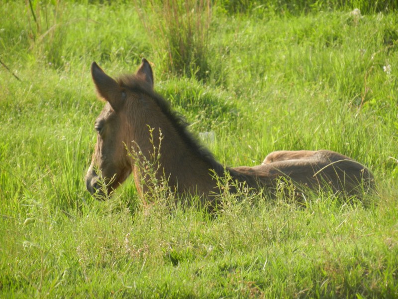 Roadside sweetness: a foal rests on the bank of a ditch while its mama grazes nearby