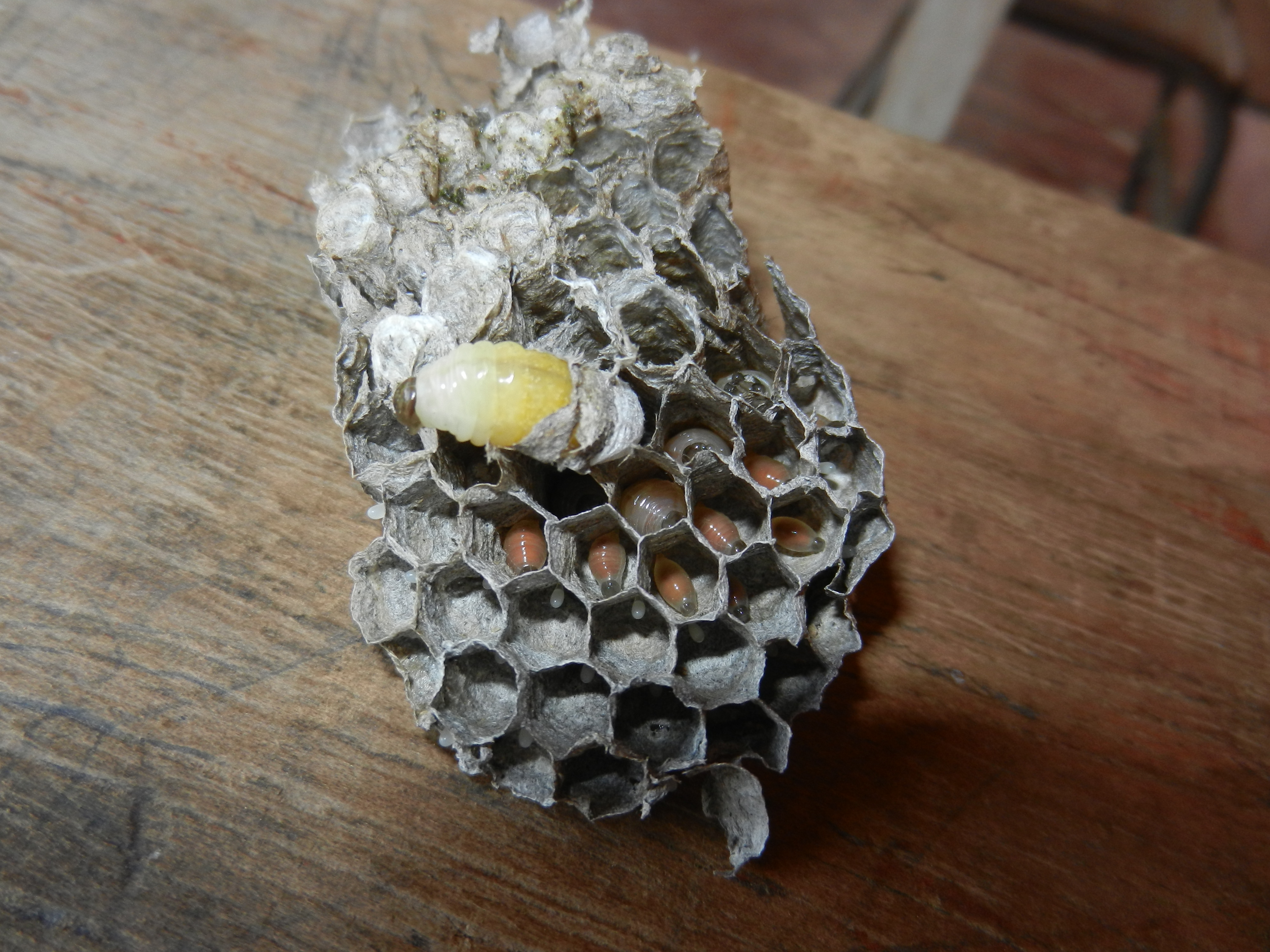 Wasp nest. Look carefully and you can see the whole cycle from tiny white eggs (photo bottom), to brown larvae (middle), to a large white pupa crawling out. The cells that are capped at photo top contained 2 ready-to-be-‘born’ adults and immediately crawled out with an attitude when I removed the top of the cell! Giant red and yellow wasps!