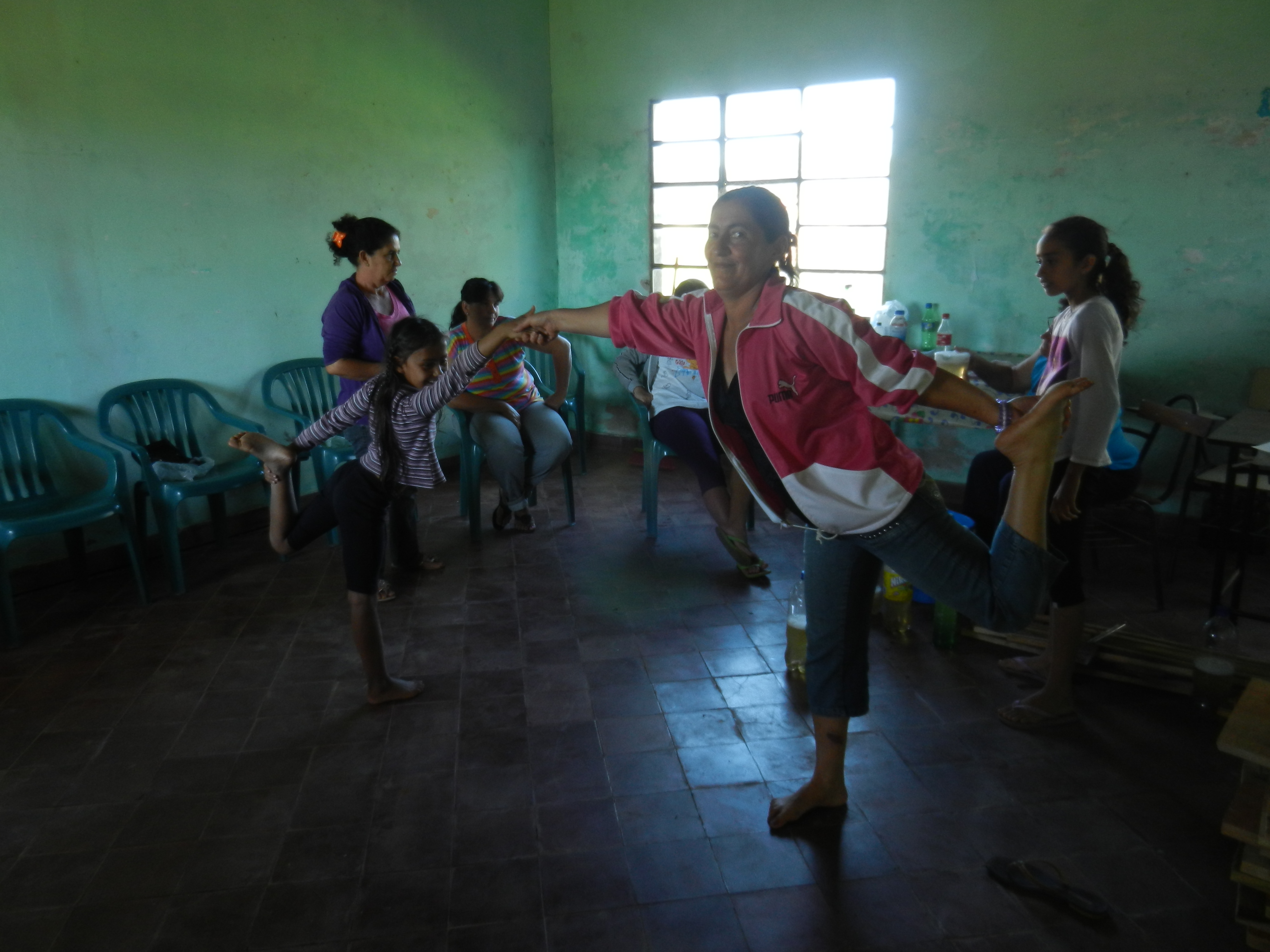 Na Ester and Ingrid practicing dancer pose after a Women’s Club yoga session