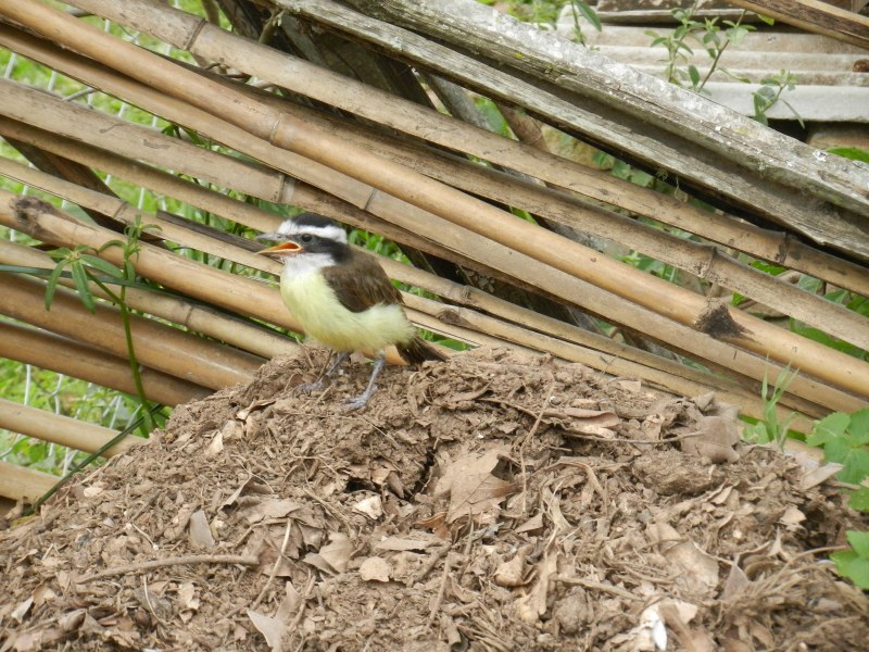 Baby woodpecker known as a Campo Flicker, sitting on my compost pile. It fell out of the nest in the tree above.