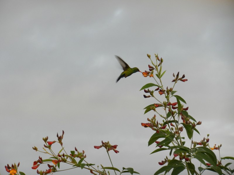 Glitter-bellied hummingbird drinking nectar from a bean tree called Kumanda Yvyra’i, with beautiful red and yellow flowers. When you crack open the bean pods the liquid in the pod smells like jasmine.