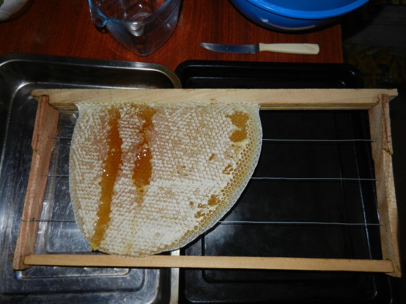 Honey harvest and processing – cutting comb, heavy with honey, from the frame