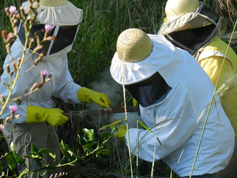 Me teaching some local señoras how to sew honeycomb onto a frame during a wild hive capture