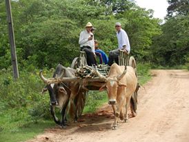 The quintessential Paraguayan scene: ox cart and men drinking terere (yerba mate). These gentlemen were delivering some bamboo we cut the day before to build my garden fence.